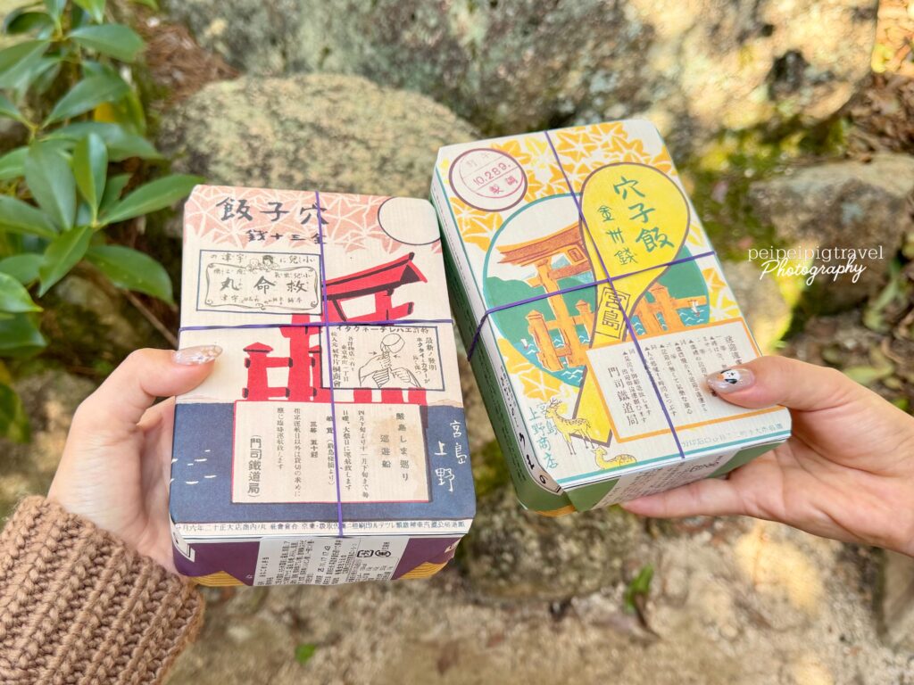 ▲ 這種包裝紙不只是防護用途,同時具備「紀念/土產感」。拿在手上更有「在地日本味」和「旅途感」。對於前往宮島或遊客來說,把便當帶上船或路途中吃,是一種整體體驗。