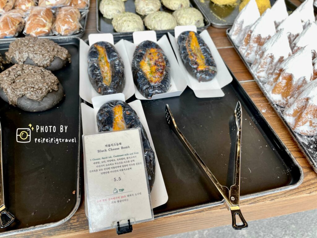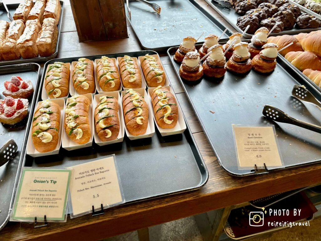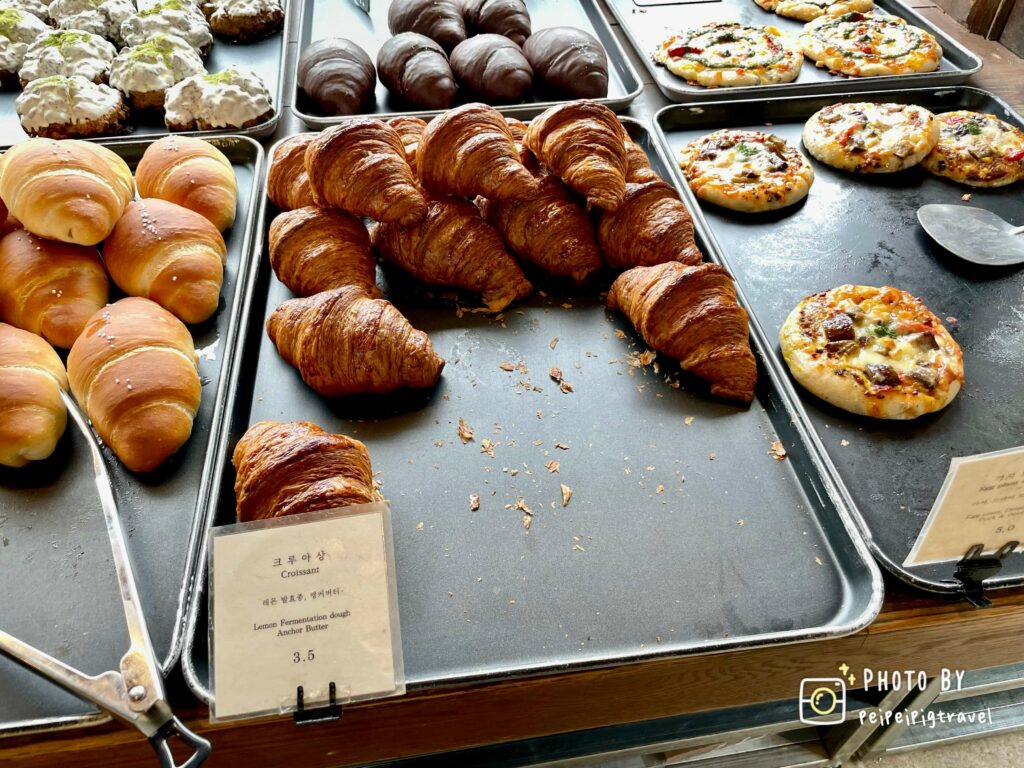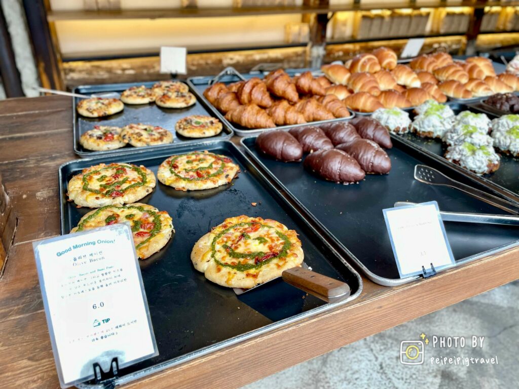 ▲ 麵包的種類會有韓文與英文的小立牌,想要吃鹹的麵包也有披薩類的麵包。