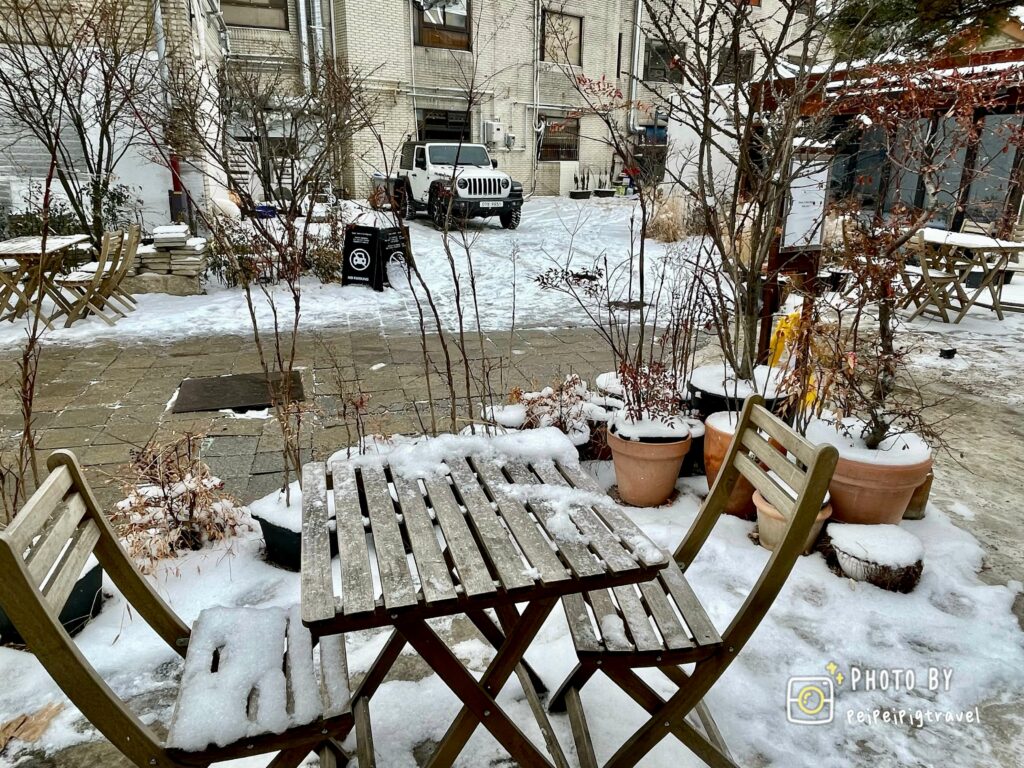 ▲ 再轉進去是四合院式的庭院,落地玻璃讓每個角落都可以照到太陽。一半作為咖啡吧台和麵包展示區,另一半是需拖鞋的傳統韓屋型座位區。裡頭也擺了幾張木桌椅和矮桌,讓不習慣在韓屋內盤腿坐的人,可以坐舒服些。