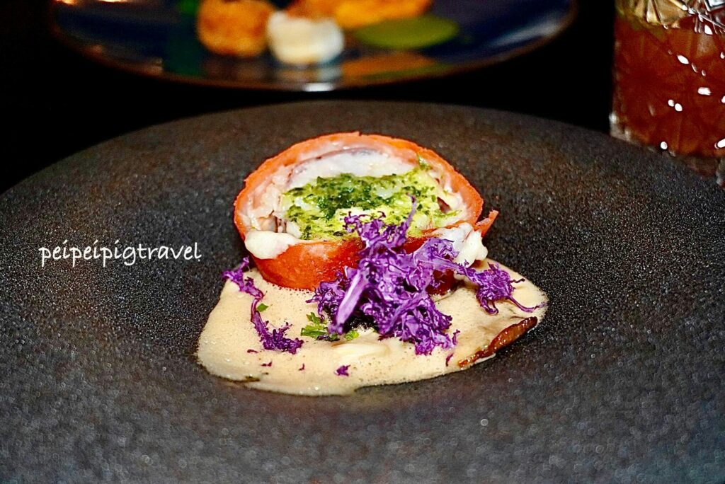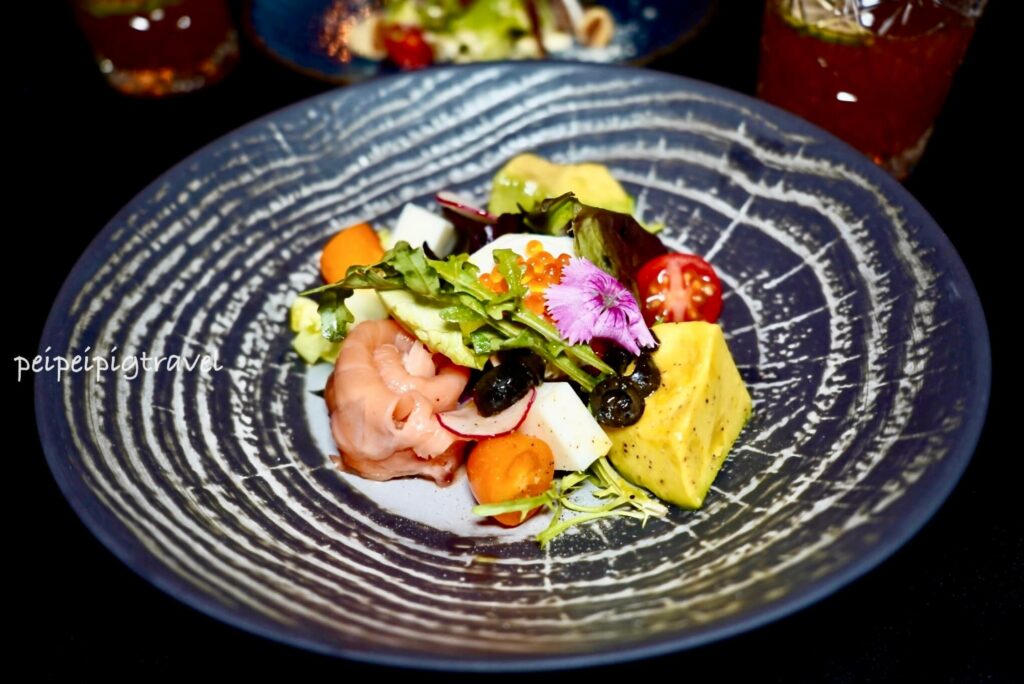 這道沙拉也很豐富,光是擺盤就有很多高級食材。蔬菜新鮮清脆,燻鮭魚加上富含油脂的酪梨吃起來很搭。
