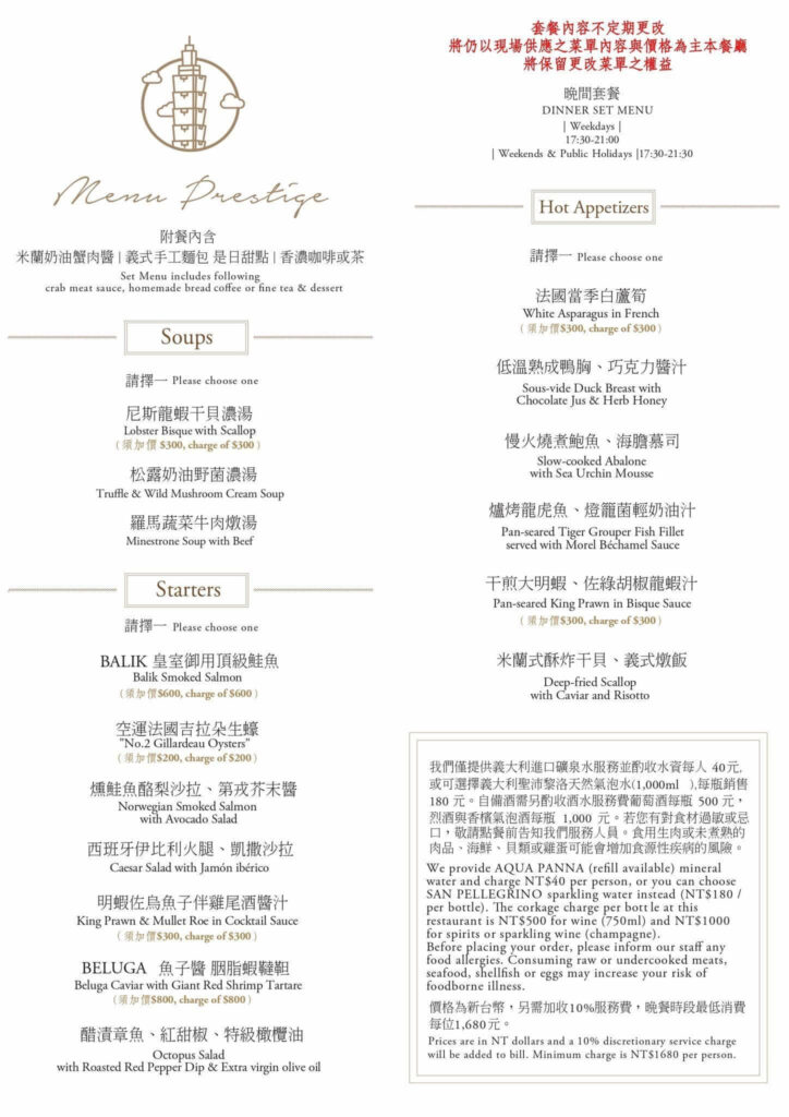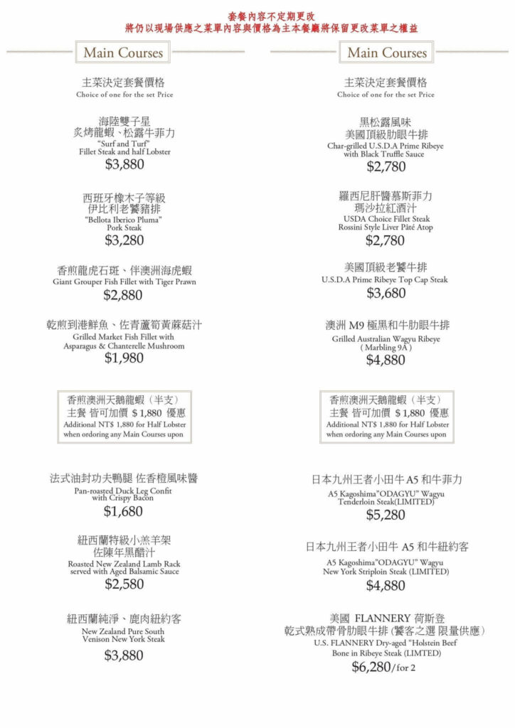 ▲ 以上是隨意鳥地方菜單供參考,套餐包括麵包和沾醬、湯品、沙拉、前菜、主菜、甜點和飲品。除了麵包和沾醬、甜點之外的品項都有多種類可選擇。價格以主菜為準,午間套餐價格落在$800~$4,880;晚間套餐價格則再高一些,會落在$1,680~$6,280。