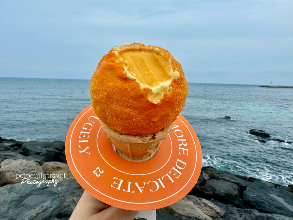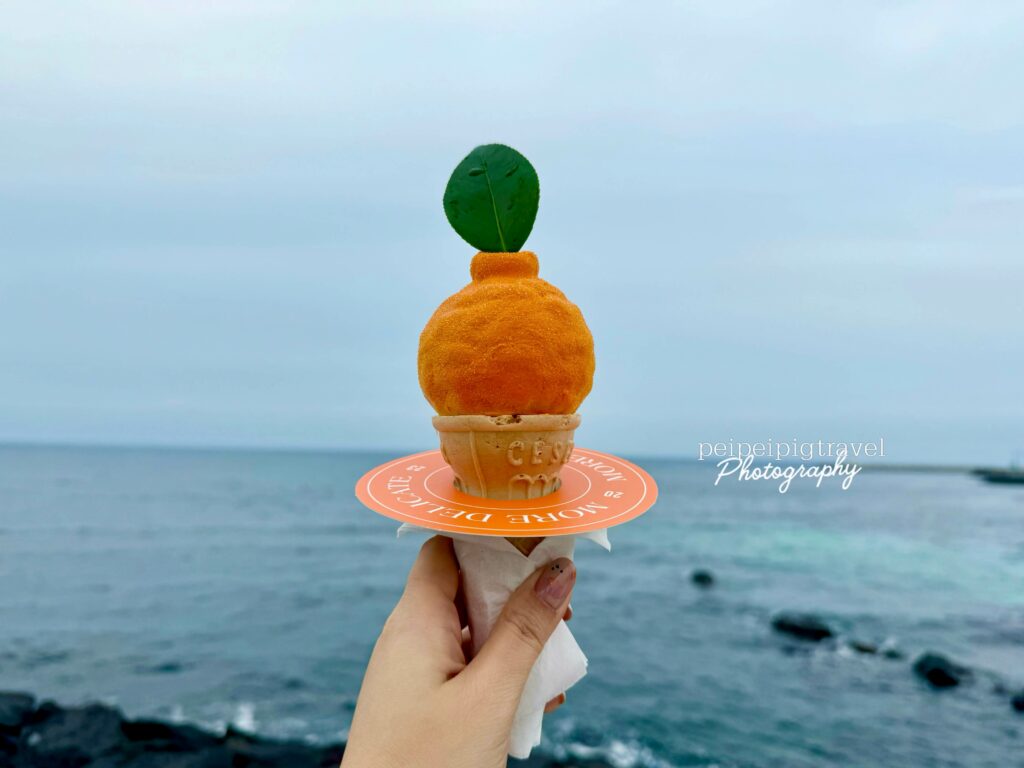▲ 擁有「柑橘之鄉」之稱的濟州島。連冰淇淋都是橘子的呦!是店內最夯的餐點!是說,橘子冰淇淋一支真的不便宜。但橘子造型的冰淇淋真的超擬真!不少人都誤以為是整顆橘子擺在甜筒上呢~