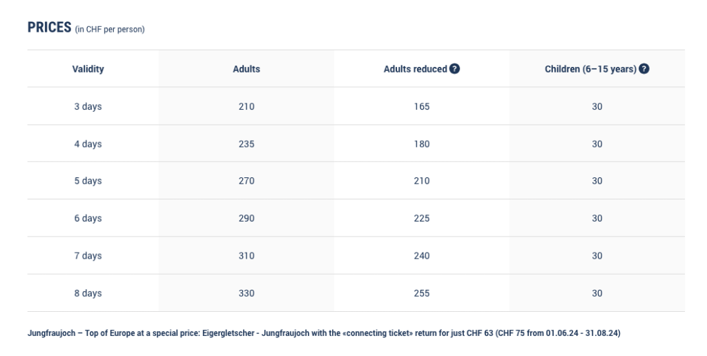如果持有「瑞士半價卡 Swiss Half Fare Card」或「瑞士旅行通行證 Swiss Travel Pass」則可以購買上方的「Adults reduced」價格。而在少女峰,不管持有什麼票券,最後的登山路段(Eigergletscher艾格冰河 ↔ Jungfraujoch少女峰)都是需要額外買票的,全票價格為一人 CHF 126(夏季一人 CHF 150 from 01.06.24 – 31.08.24)