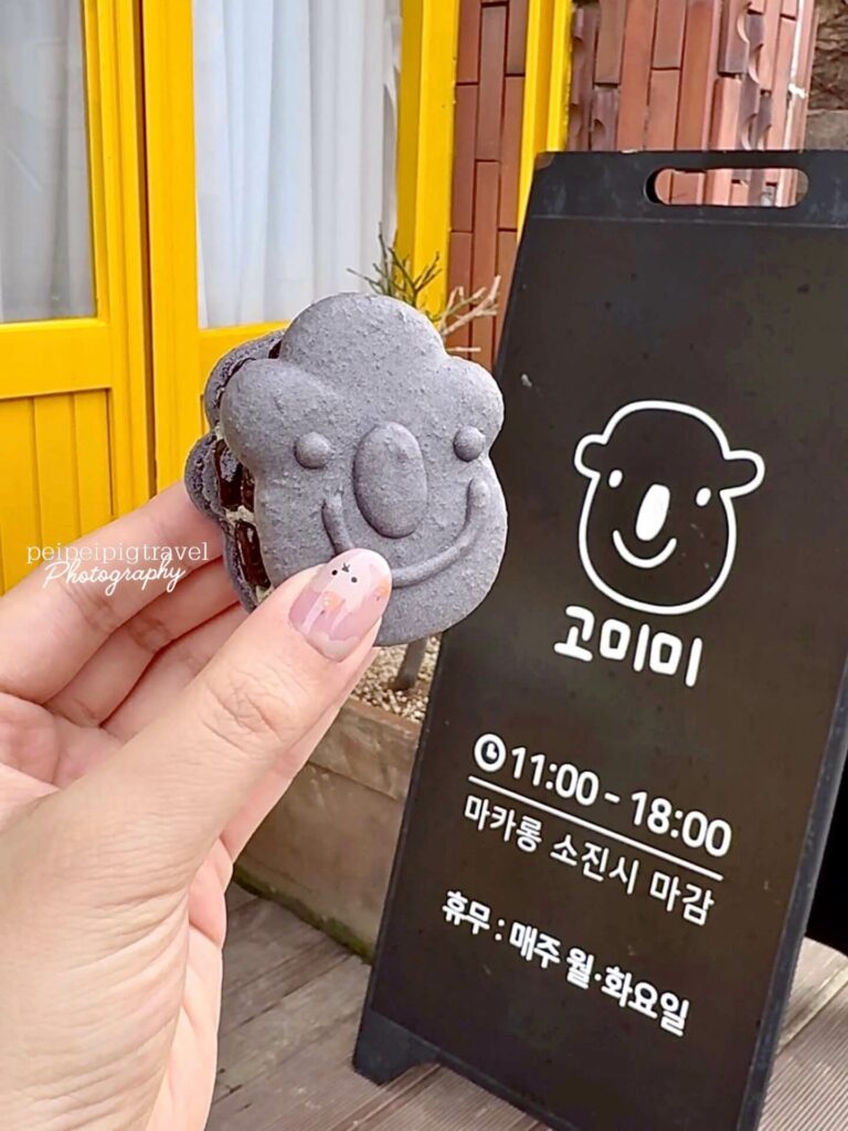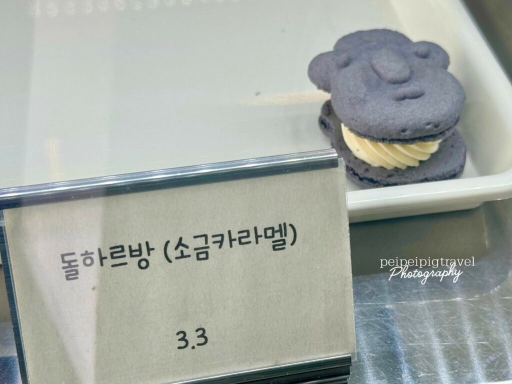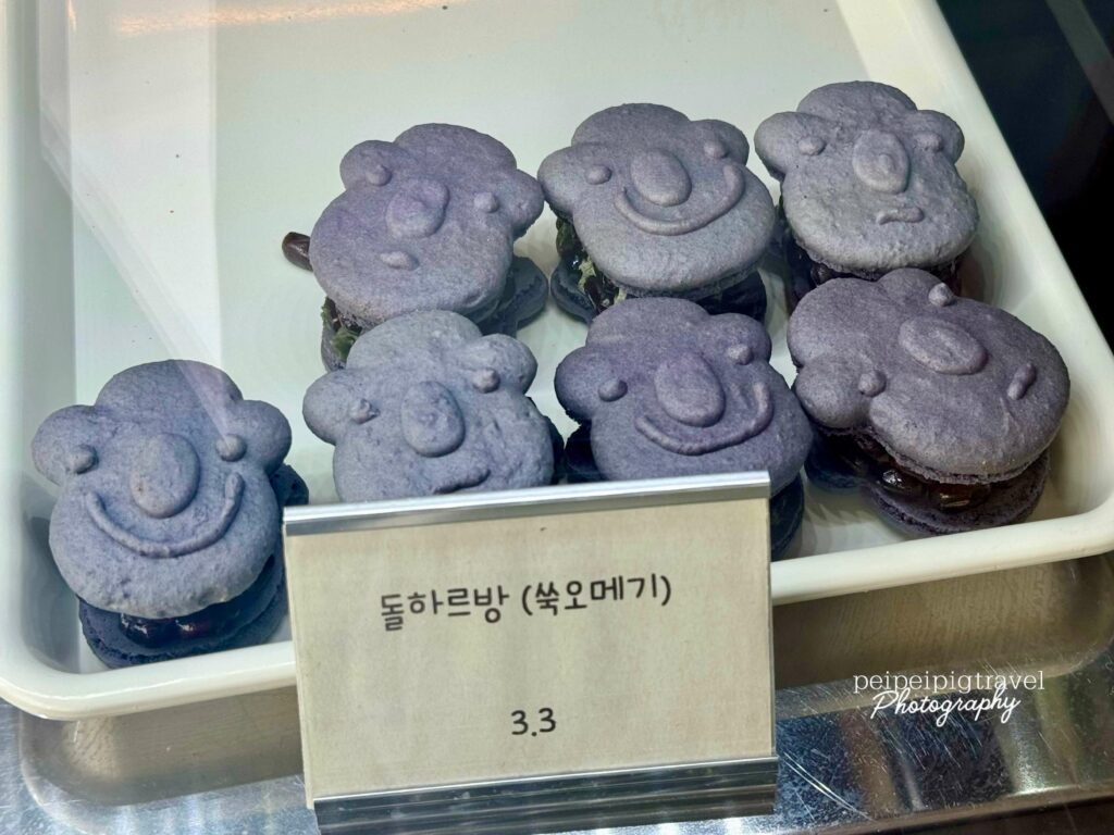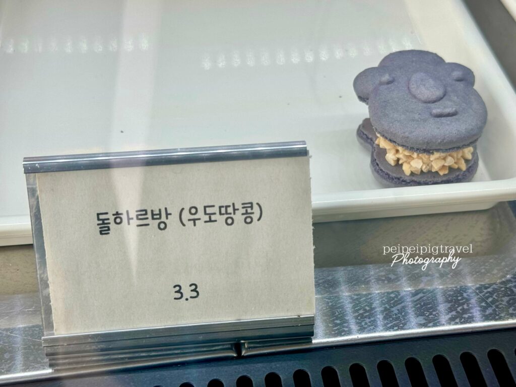 ▲ Komimi Café 把馬卡龍做成濟州島爺爺及山茶花的可愛造型。都極具濟州特色!一顆₩2500~₩3300左右。放冷藏可保存2天,冷凍2週。