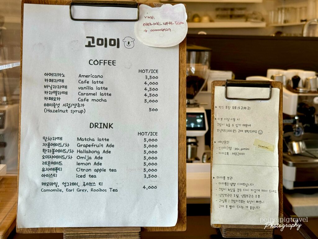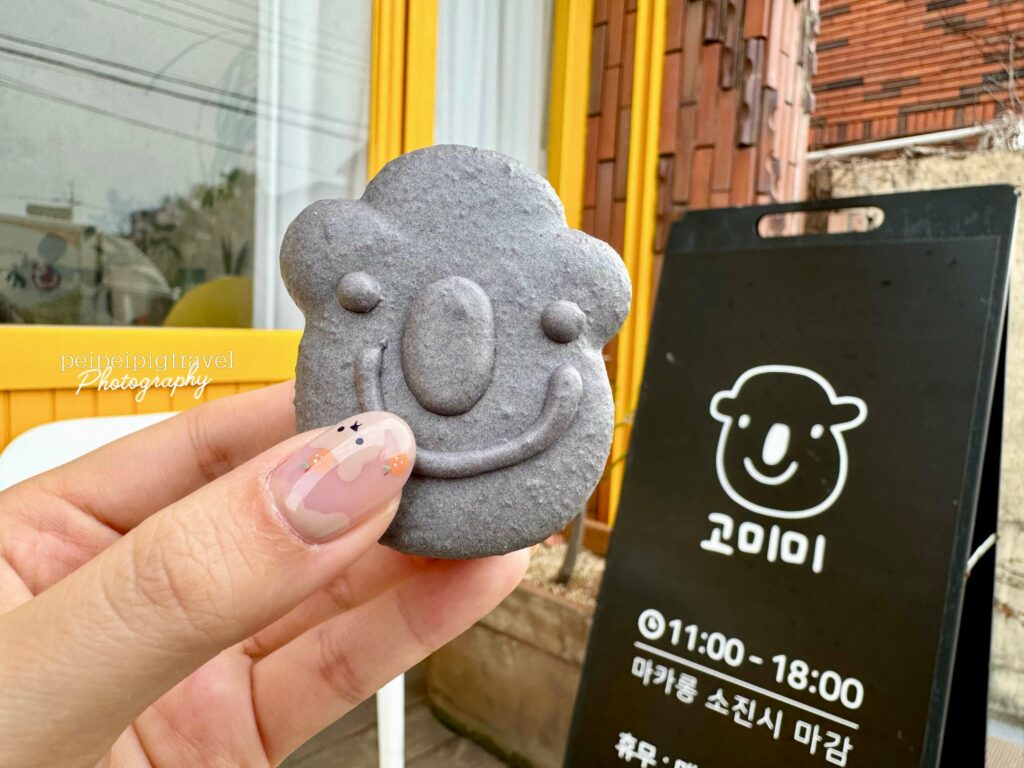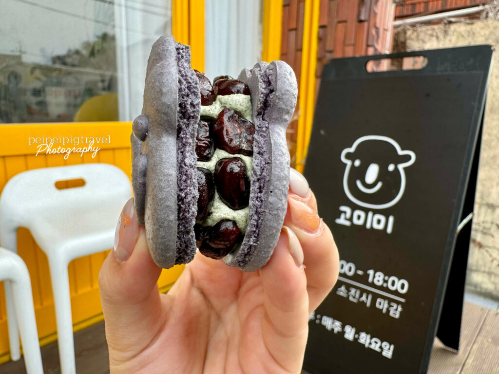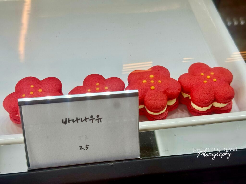 ▲ Komimi Café 把馬卡龍做成濟州島爺爺及山茶花的可愛造型。都極具濟州特色!一顆₩2500~₩3300左右。放冷藏可保存2天,冷凍2週。