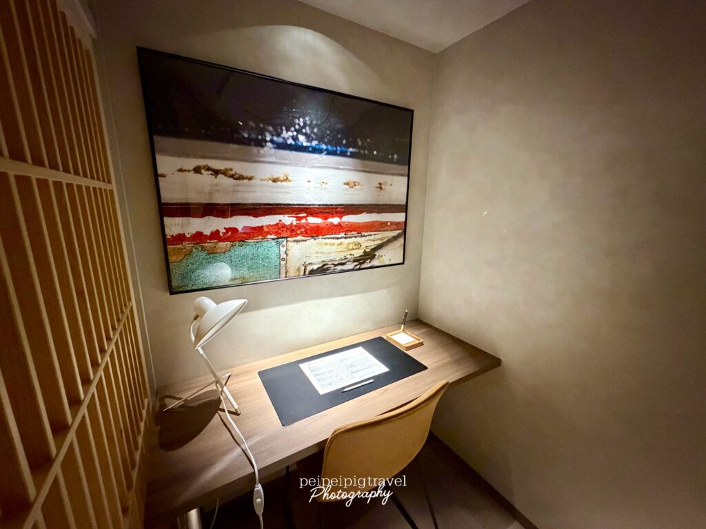 ▲ 房內設有一個小空間,這是房間裡專為「放慢節奏」而打造的空間。整體採簡約日式現代風格,線條乾淨俐落、材質質感細膩,留白適中,讓人不會有任何壓迫感。柔軟的沙發與單椅隨意擺放,無論是躺著、靠著或坐著,都能自由享受閱讀、品茶或放空的片刻。此空間還設有書架,精選書籍靜靜排列,提供旅人一個靜下心來翻閱或隨手瀏覽的角落,讓空間更具生活感與文化氛圍。