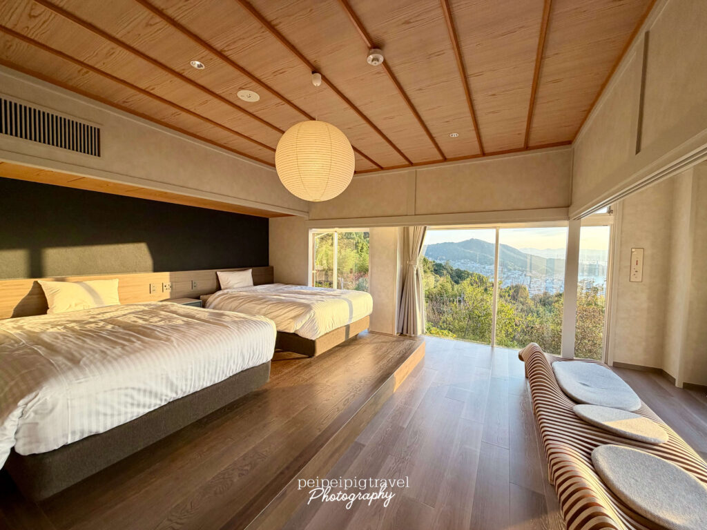 ▲ 房間分成三個區域:臥室/小客廳/海景觀景沙發區。推開房門的瞬間,整片海景透過落地窗迎面而來,是簡約日式現代風。木質香氣與自然光交織,讓人立刻從生活裡退一步、進入旅行節奏。