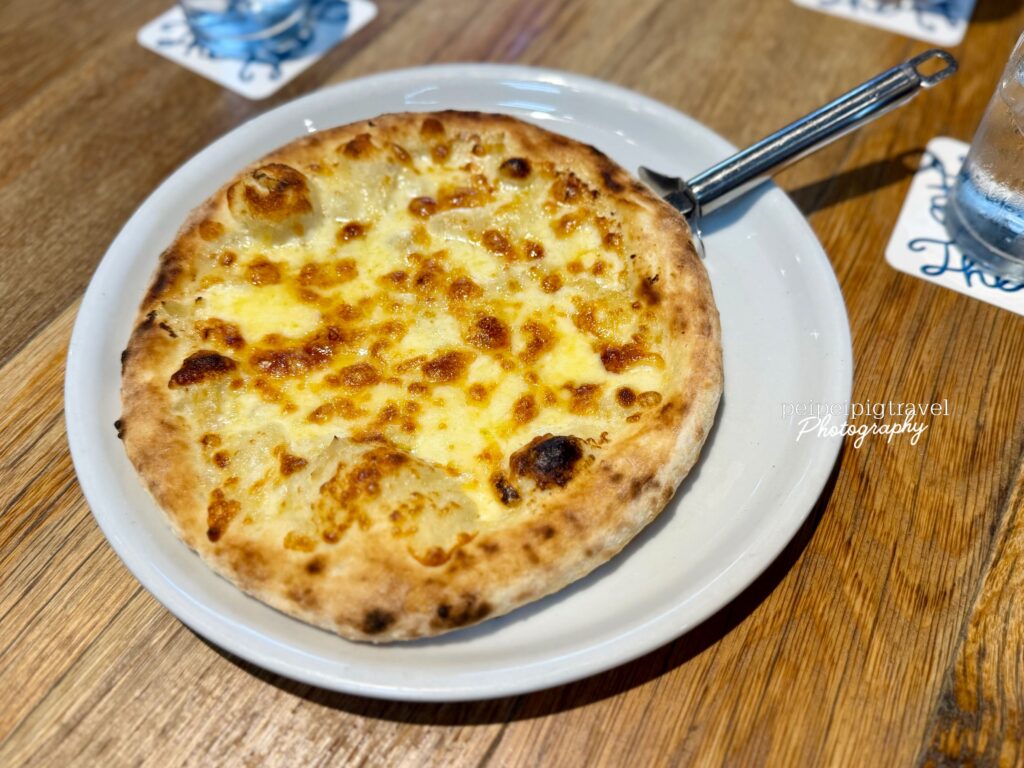 這道是非常清爽的創意口味。餅皮經過窯烤後,外層微微酥脆,邊緣帶有焦香,而內層仍然柔軟有彈性,每一口都能感受到手工麵糰的嚼勁。上面的鹽漬檸檬切片散發出淡淡的果香氣和海鹽的鹹味,與白色起司的奶香完美融合,使整體口感清爽卻不單薄。