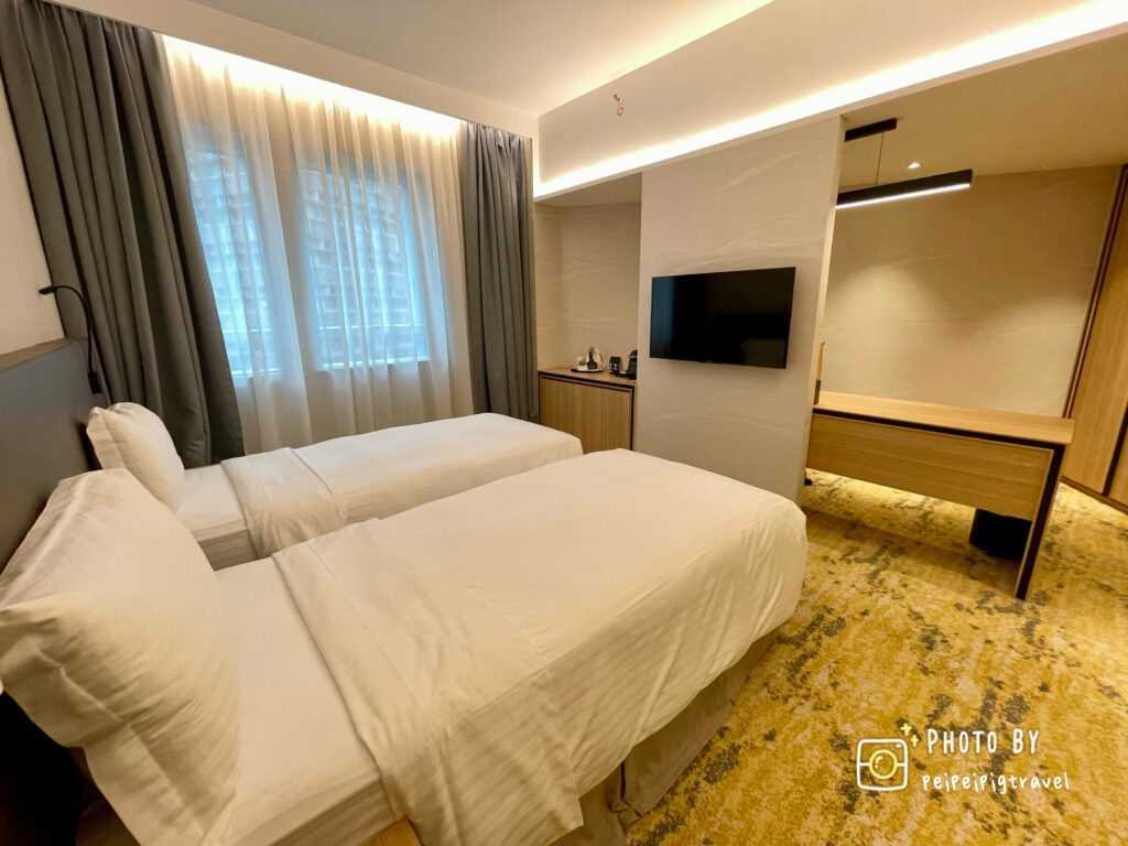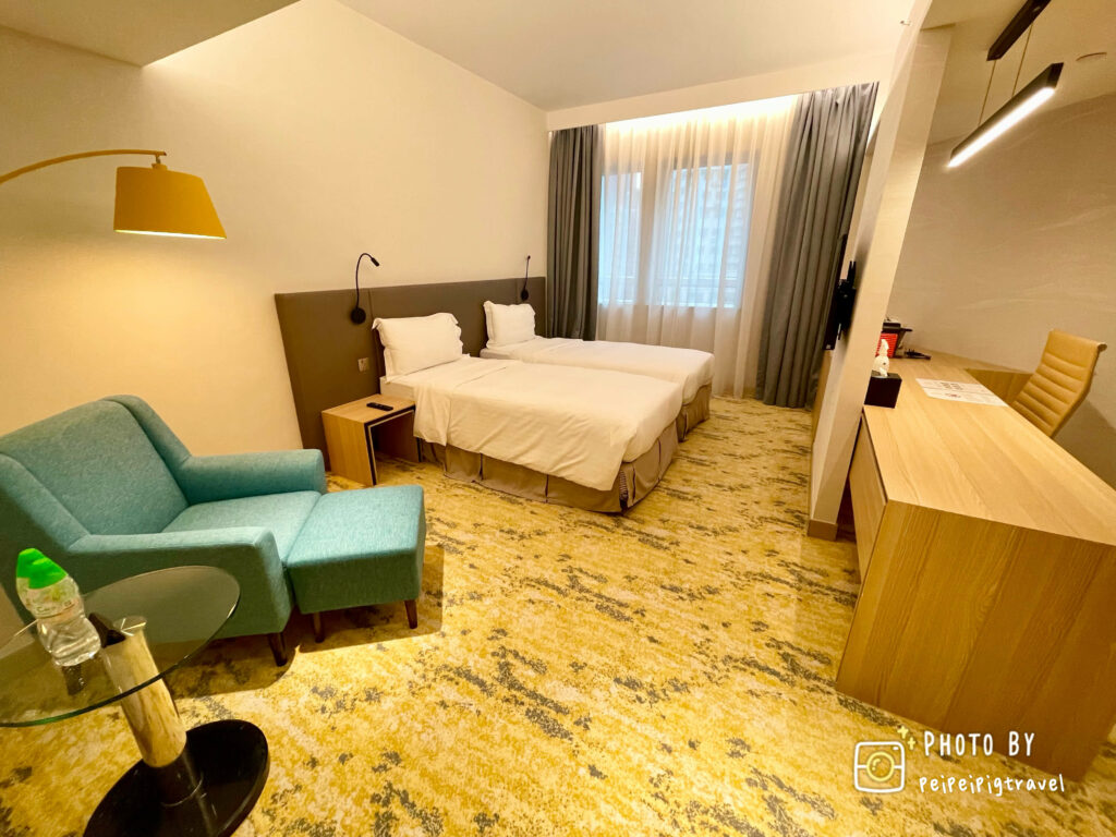▲ 房間乾淨明亮,黃光色調讓整體更溫馨。插座很多,也有USB孔的。兩張單人床放下之後,空間還是很大~